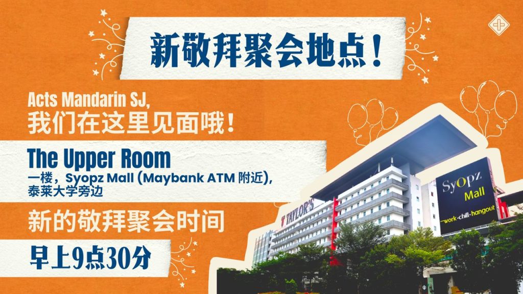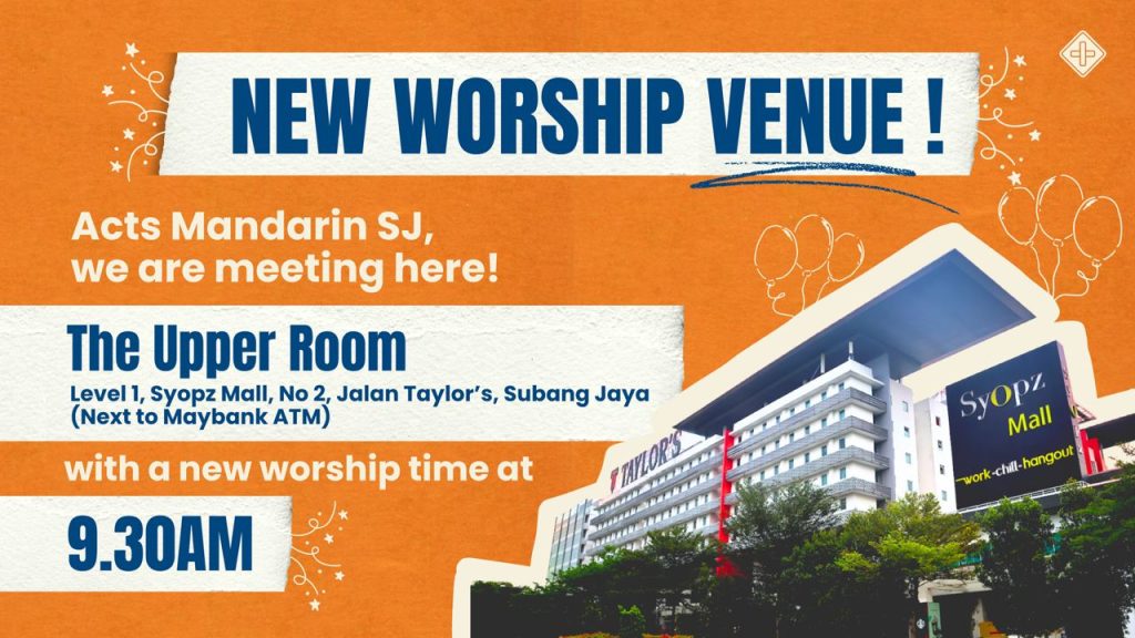 Acts Mandarin SJ has moved to a new place (The Upper Room at Syopz Mall) – with new a timing at 9:30am! Kindly help share this out and invite your friends and family to come join us!